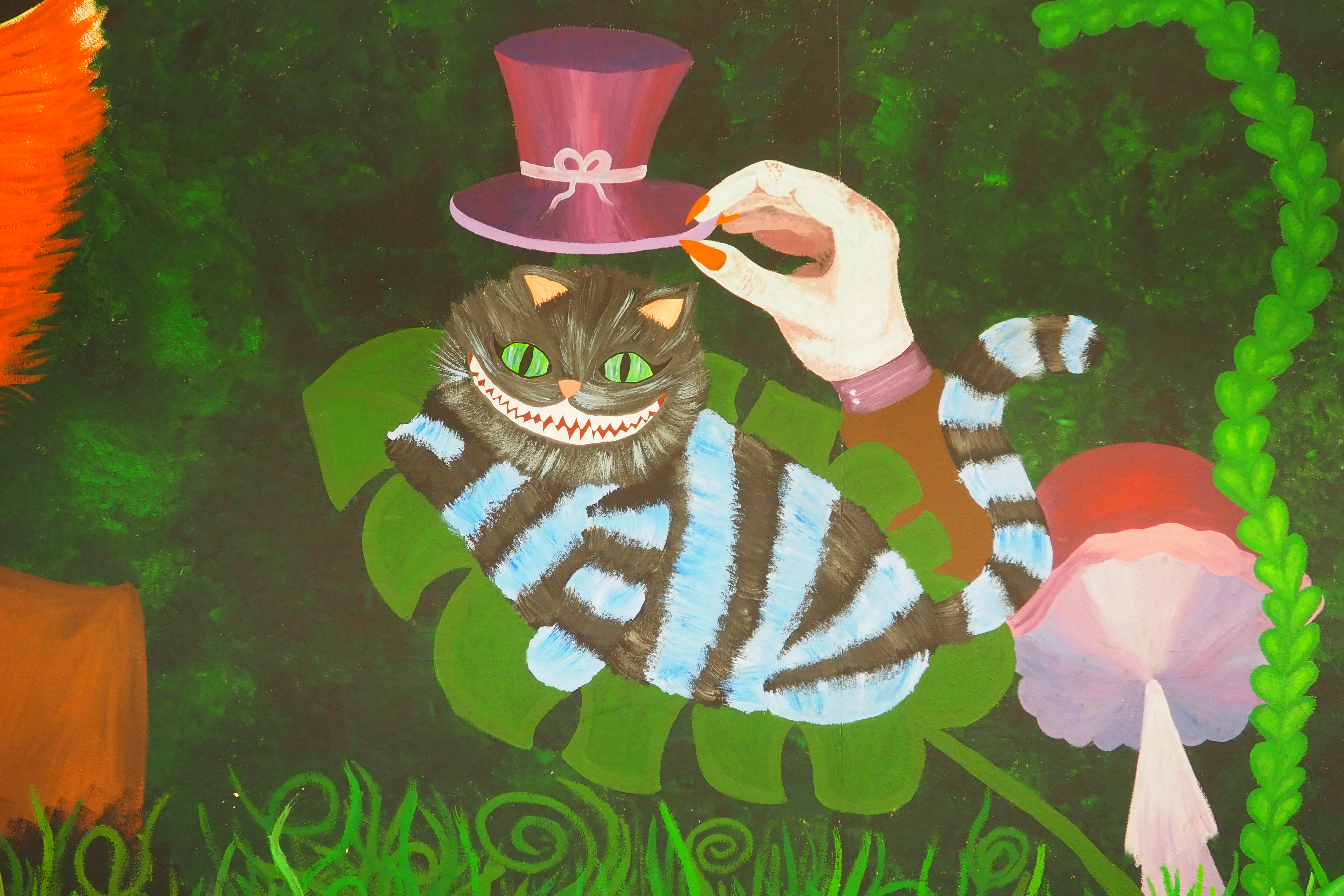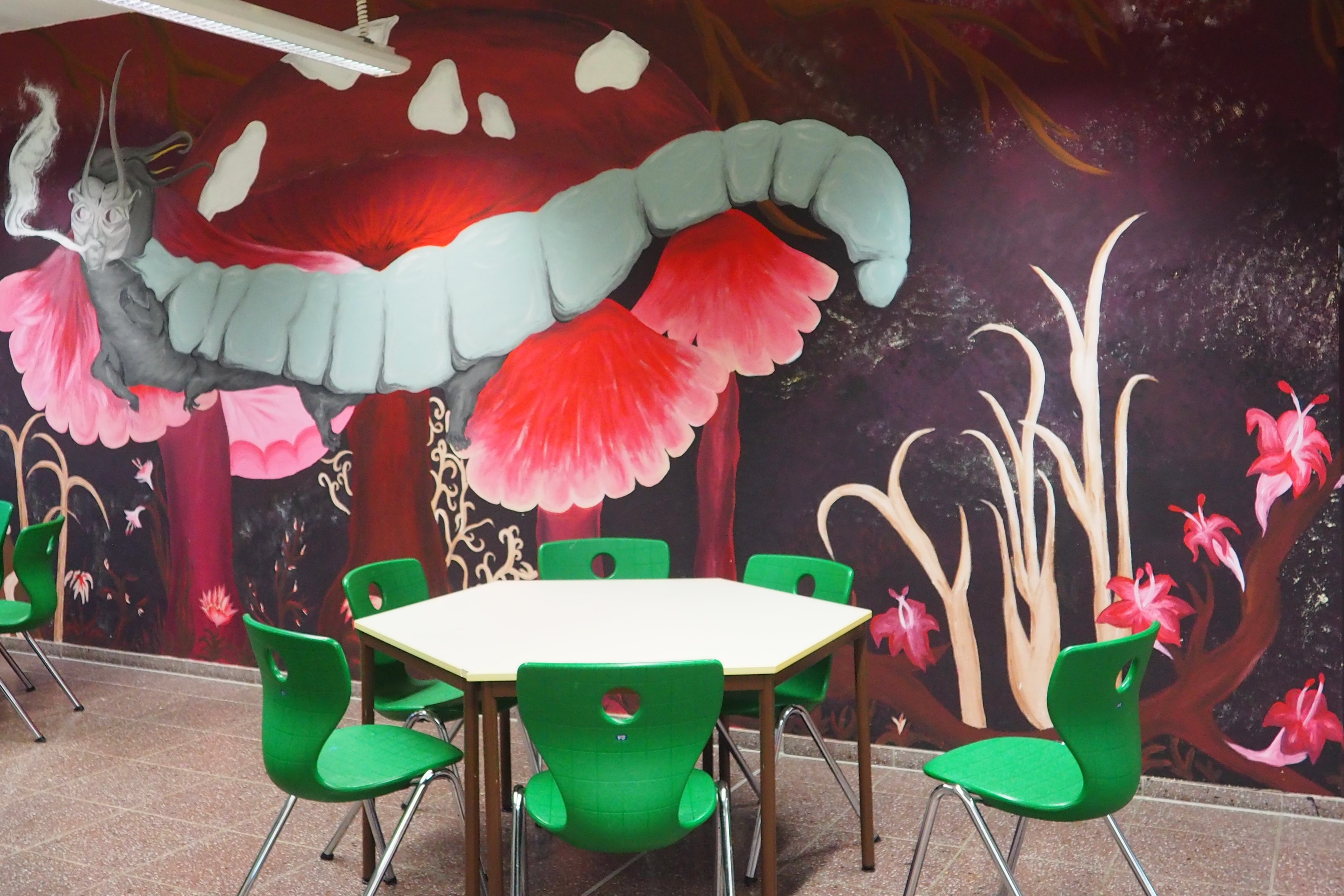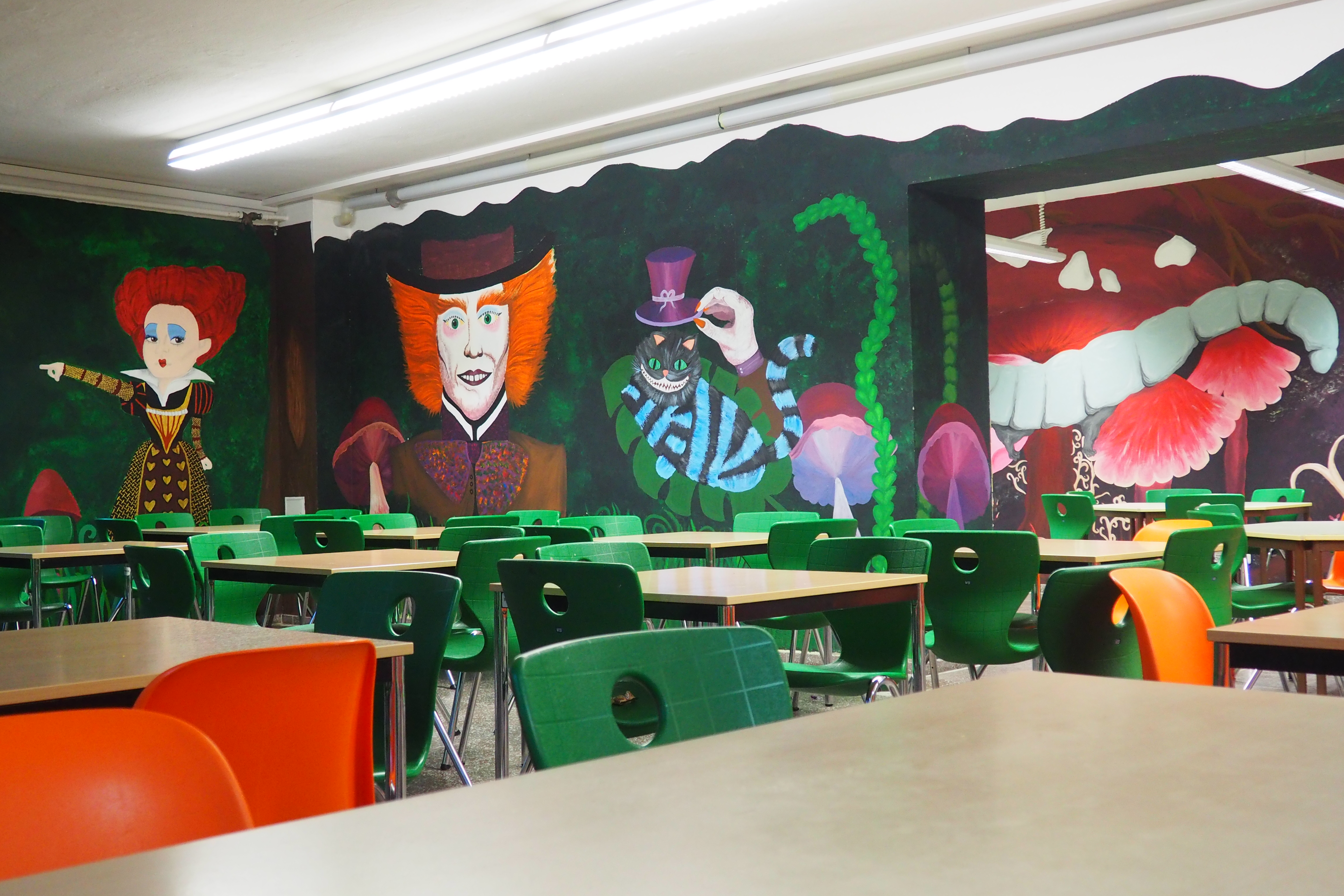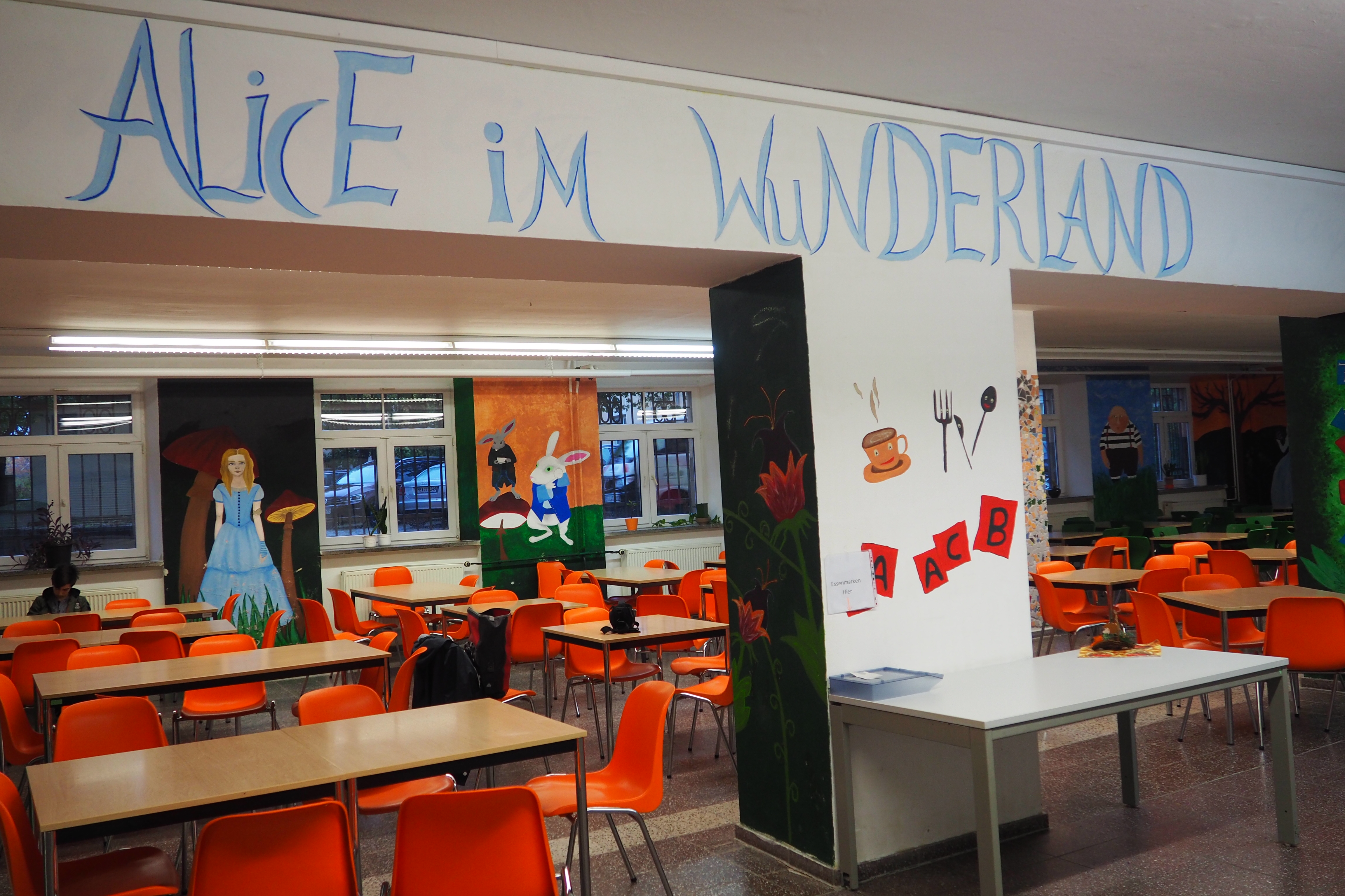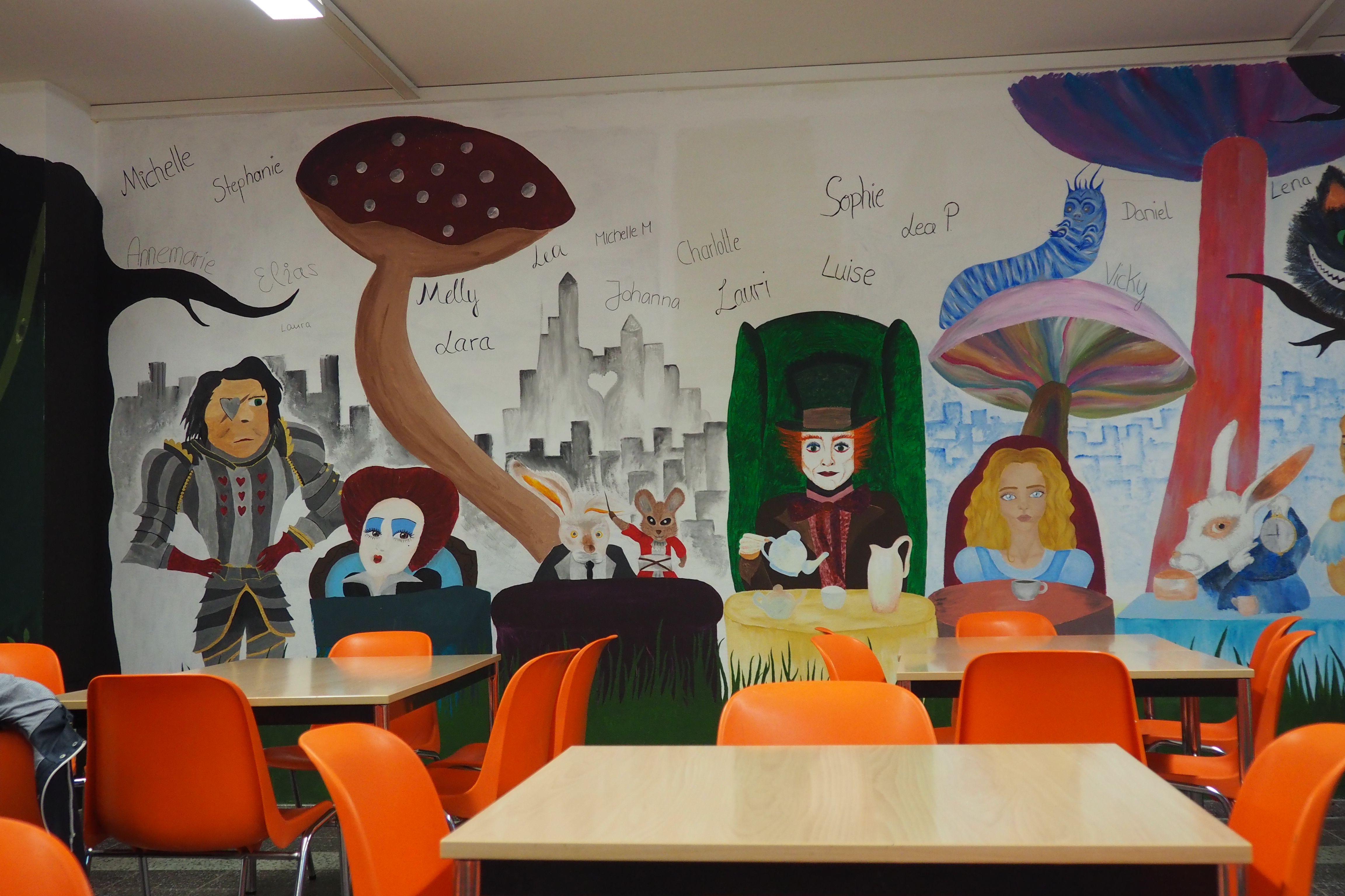 Bevor es mit Pinsel und Farbe an die Wand ging, musste ein Thema gefunden und ein Konzept erarbeitet werden, damit jedes einzelne Bild ein Teil eines großen Gesamtkunstwerkes darstellt. Die Schüler*innen einigten sich auf das Thema „Alice im Wunderland“ nach dem gleichnamigen Buch des britischen Autors Lewis Carroll. „Da vor allem Schüler*innen der Sekundarstufe I häufiger zum Mittagessen in die Mensa gehen, ist die Erzählung „Alice im Wunderland“ weder zu kitschig noch zu kindisch, so dass sich Schüler*innen bis zur Klassenstufe 9 mit der Geschichte identifizieren können.“, berichtete Frau Seidel, die Lehrerin des Kunstleistungskurses.