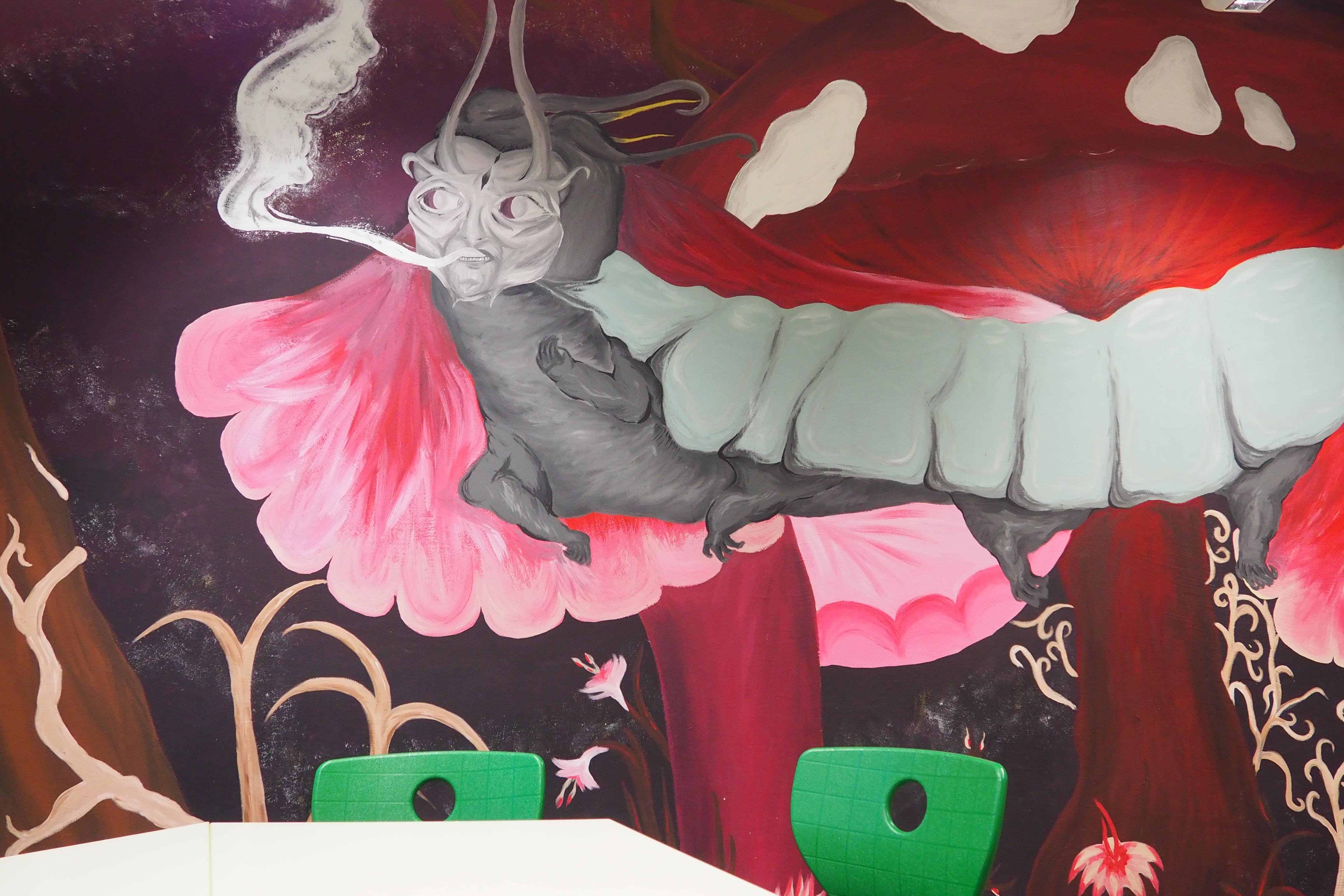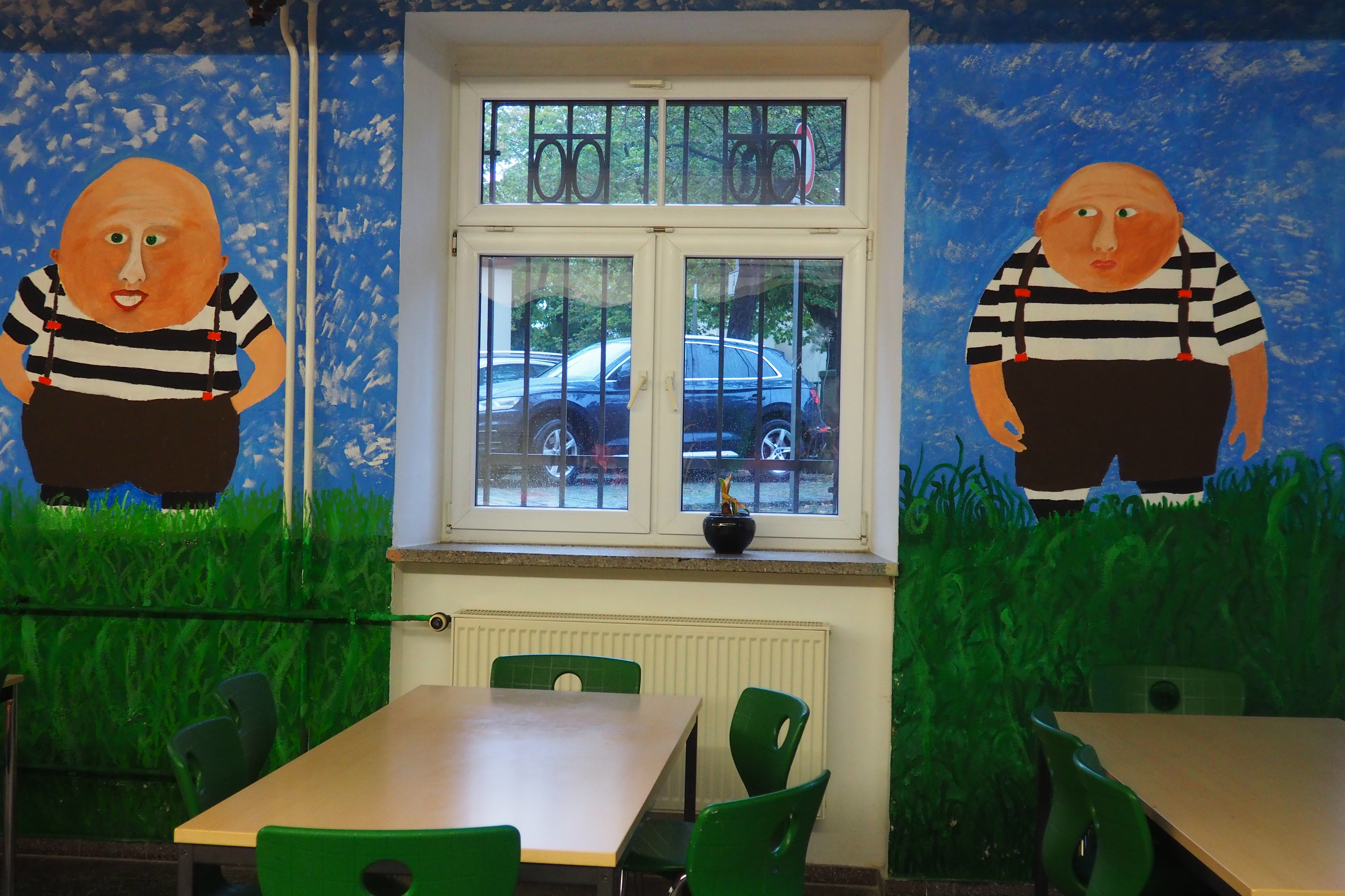 Die Umsetzung des Projektes erfolgte im laufenden Schulbetrieb. Die Schüler*innen arbeiteten in Gruppen zusammen und malten die Wesen und Fabeltiere frei und ohne Projektion der Bilder mittels Acrylfarbe an die Wand. Dazu nutzen sie jede der fünf Kunststunden pro Woche, um vormittags von 9:00 Uhr bis 10:50 Uhr zu zeichnen. Nach jeder Stunde wurden die Unterlagen, Farben und Pinsel weggeräumt, damit ab 10:50 Uhr der normale Essensbetrieb stattfinden konnte. Vorteilhaft erwies sich, dass die Kunststunden zusammenhängend am Vormittag geplant waren. Damit standen mindestens 90 Minuten für die Gestaltung der Wände zur Verfügung, die Farben konnten bis zur nächsten Kunststunde trocknen und wenn nötig konnte am Nachmittag noch weitergearbeitet werden. Insgesamt dauerte das Projekt mit Vorbereitung drei Monate.