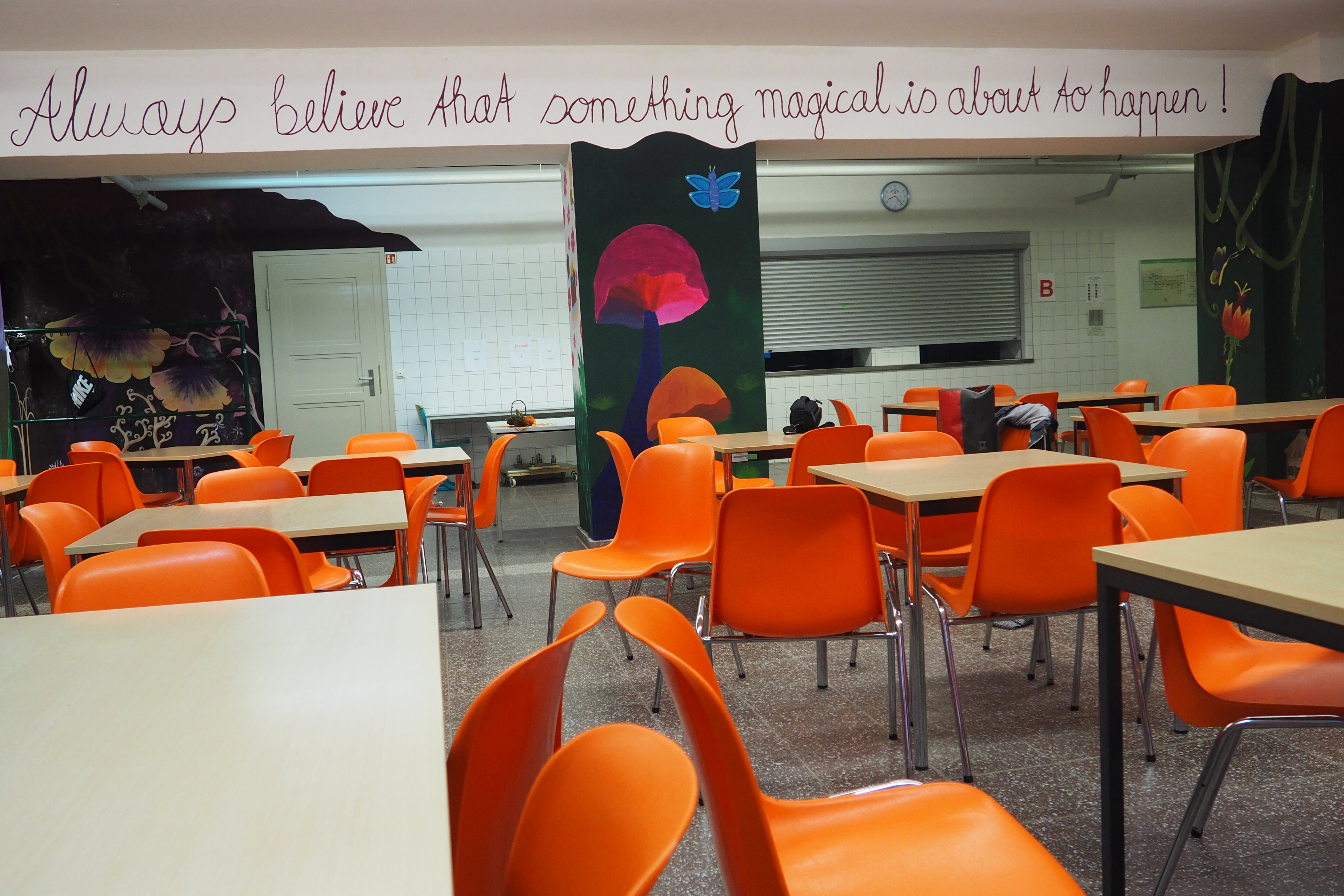 Ausgangslage – Schulmensa mit weißen Wänden und vereinzelten Bildern